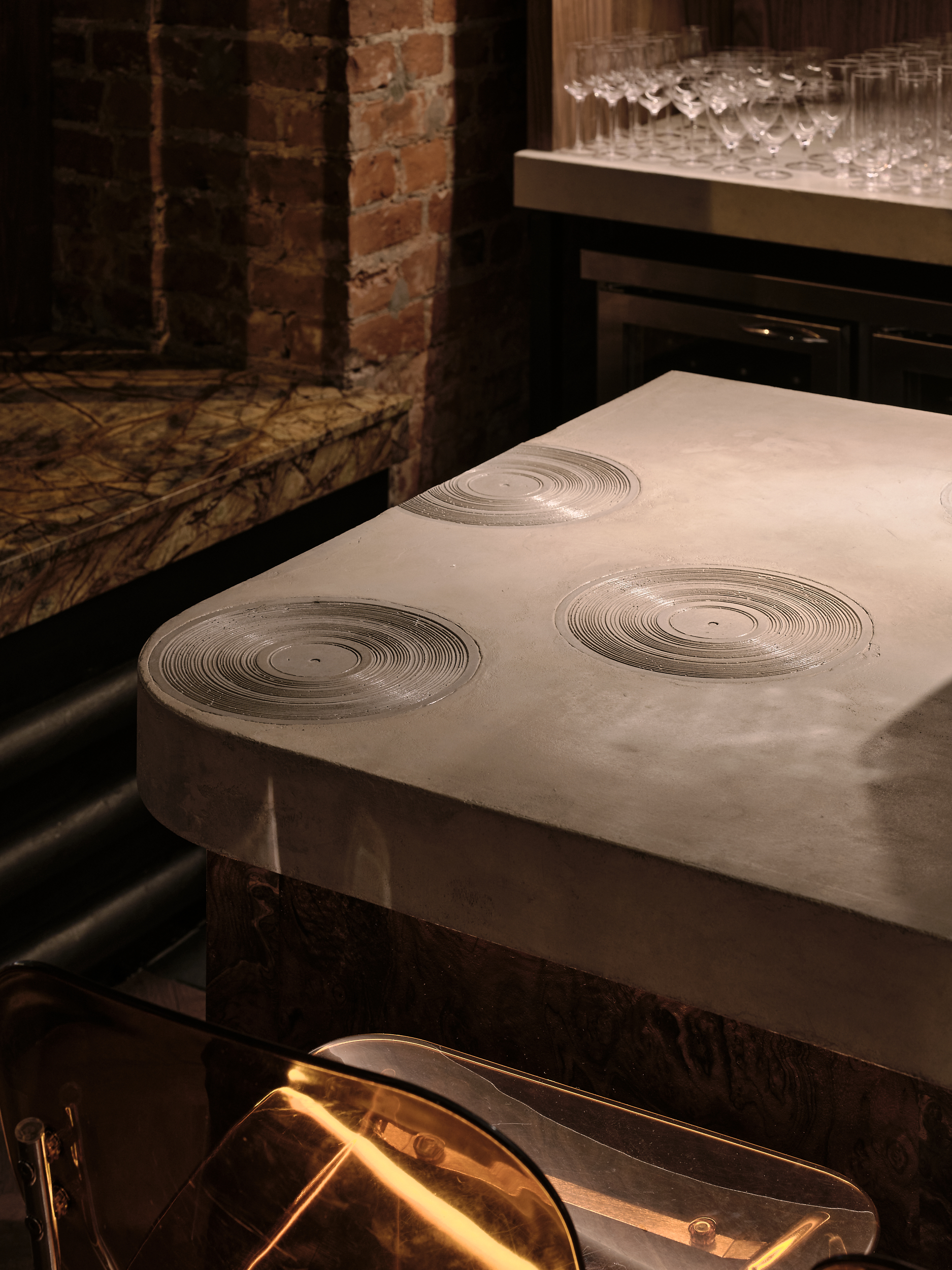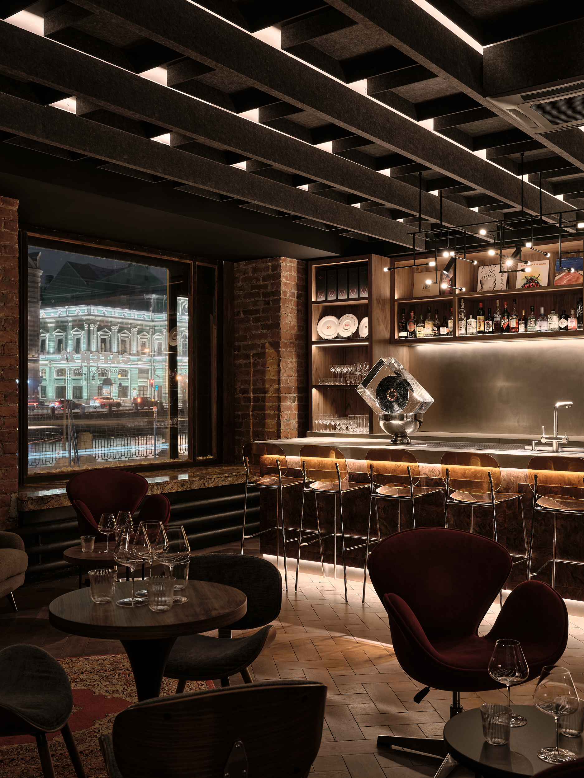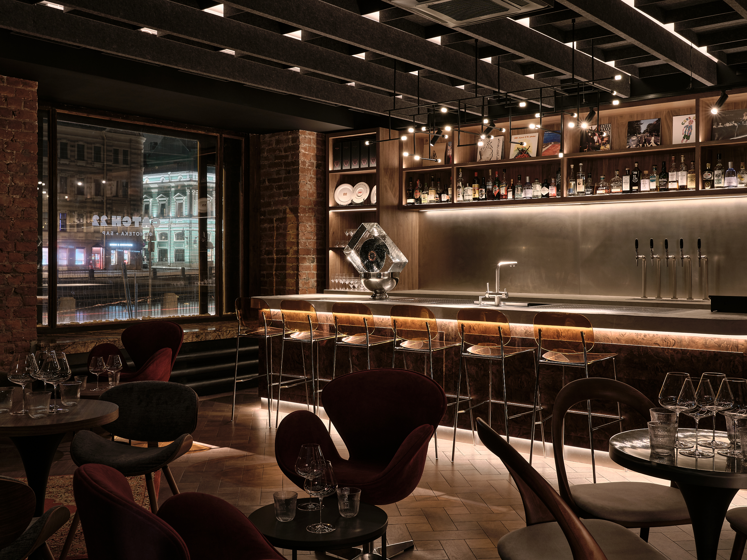 A key tenet of the Catch 22 listening bar interior was the integration of existing characterful materials and finish into a harmonious and atmospheric environment. This included brick walls and deep, marble window cills that were reutilised as cosy seating areas. These industrial finishes were softened with reclaimed oak parquet flooring, rugs and rich velvet curtaining. The materials used were also chosen for their sound-insulating properties in order to ensure optimum clarity of sound in the listening bar.