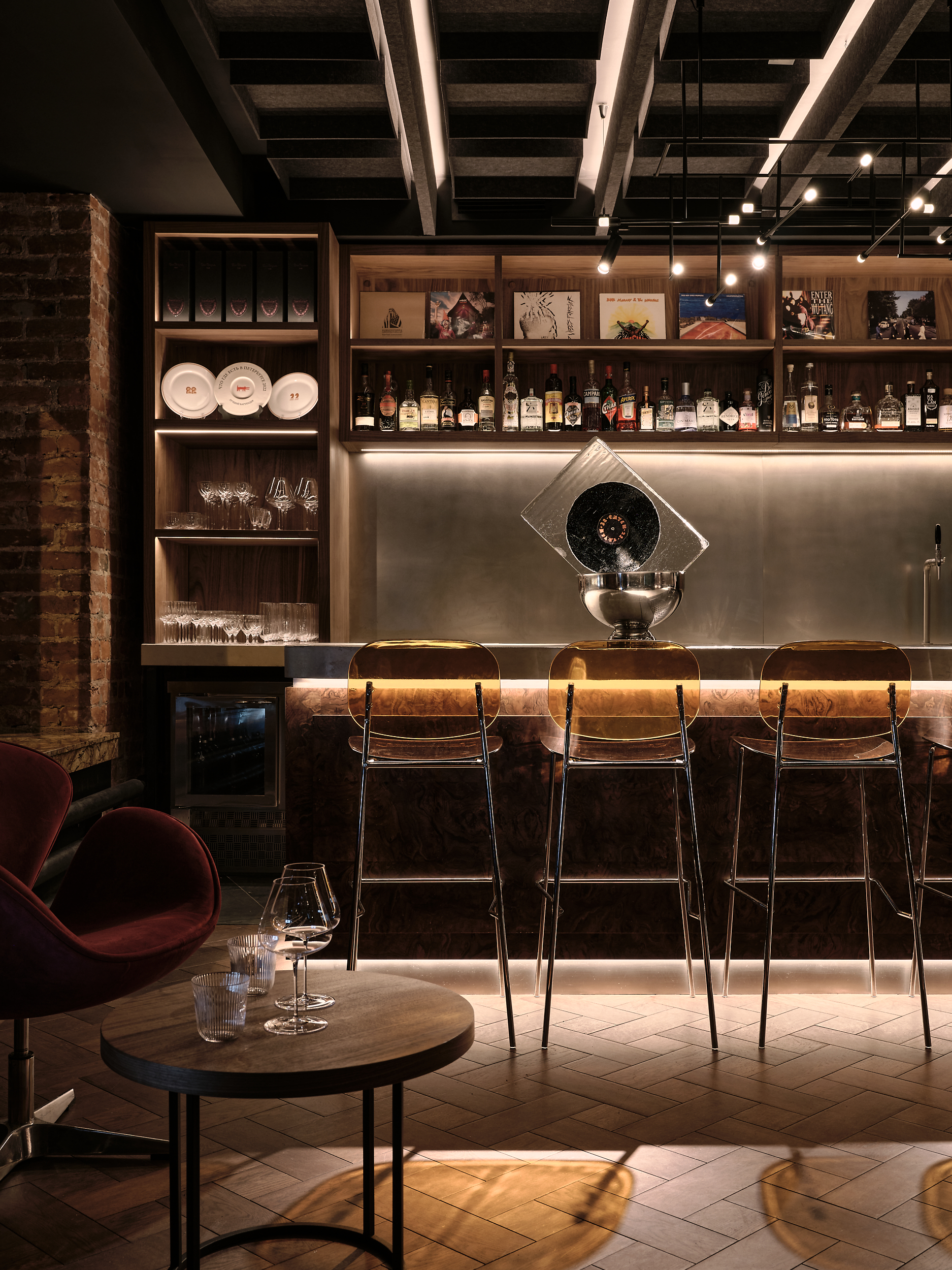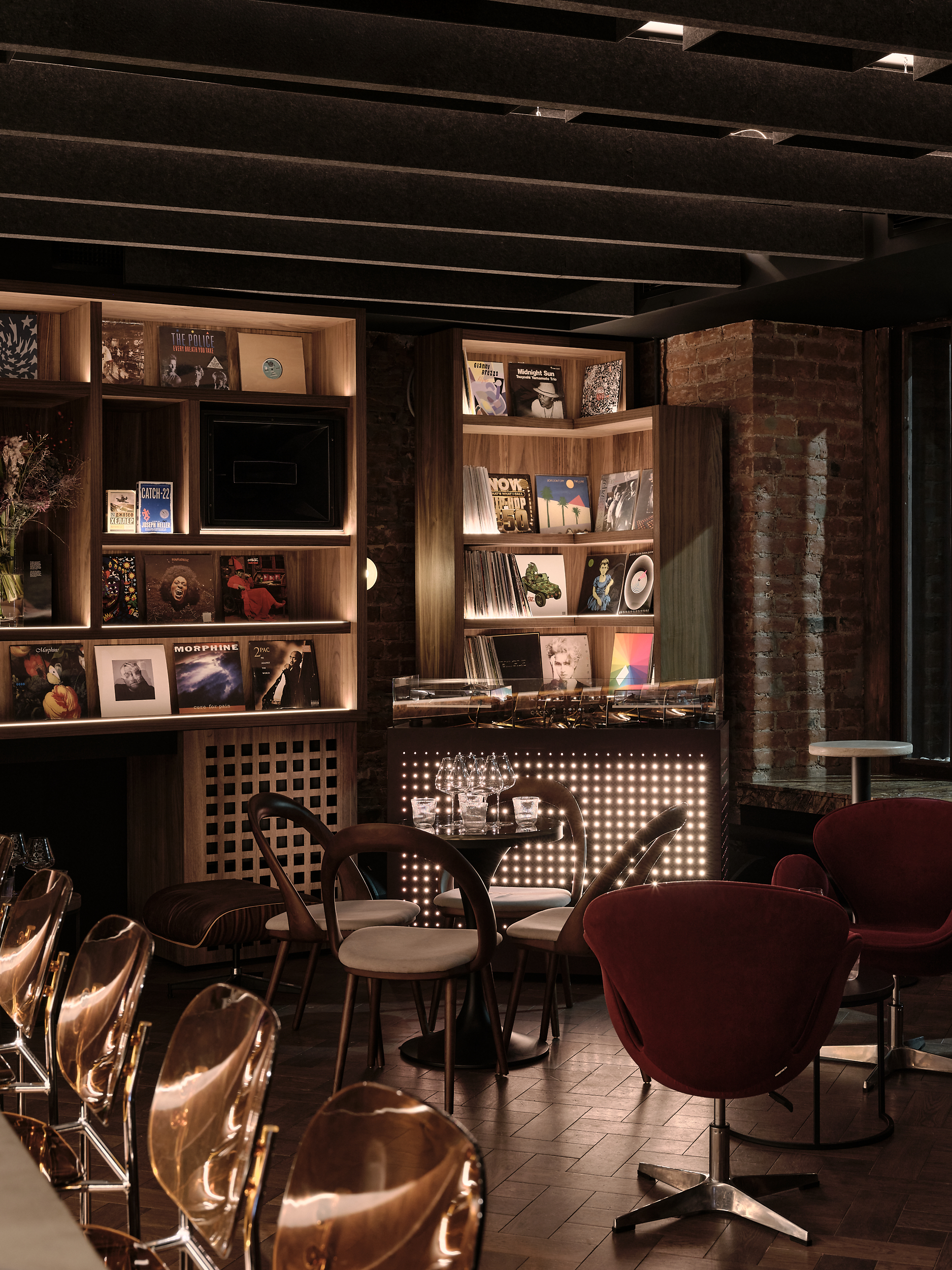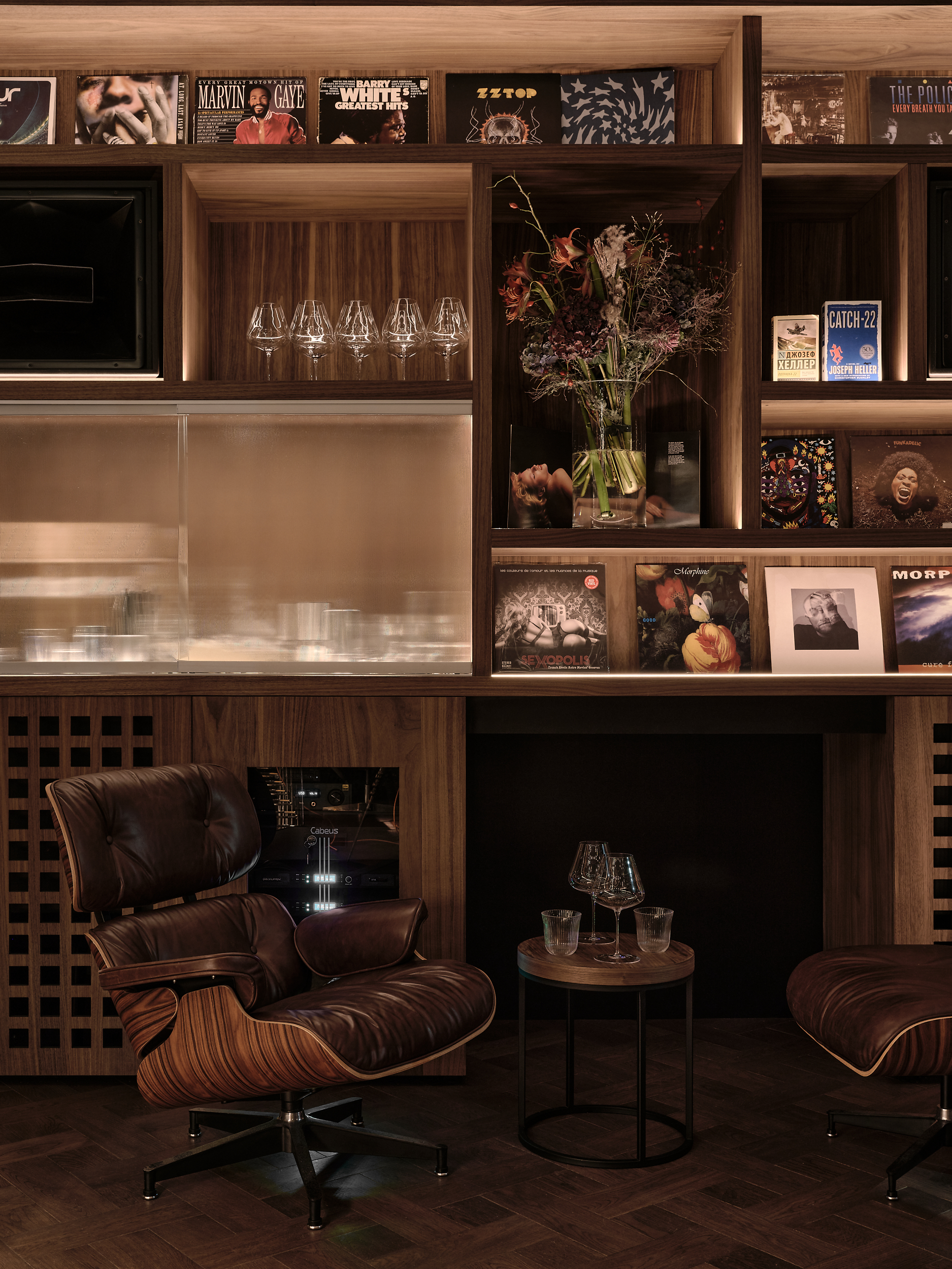 The centrepiece is the bar counter – finished in Walnut Burl veneer. A custom shelving unit in American Walnut houses the bar’s vinyl collection, memorabilia as well as the impressive hi-fi equipment.