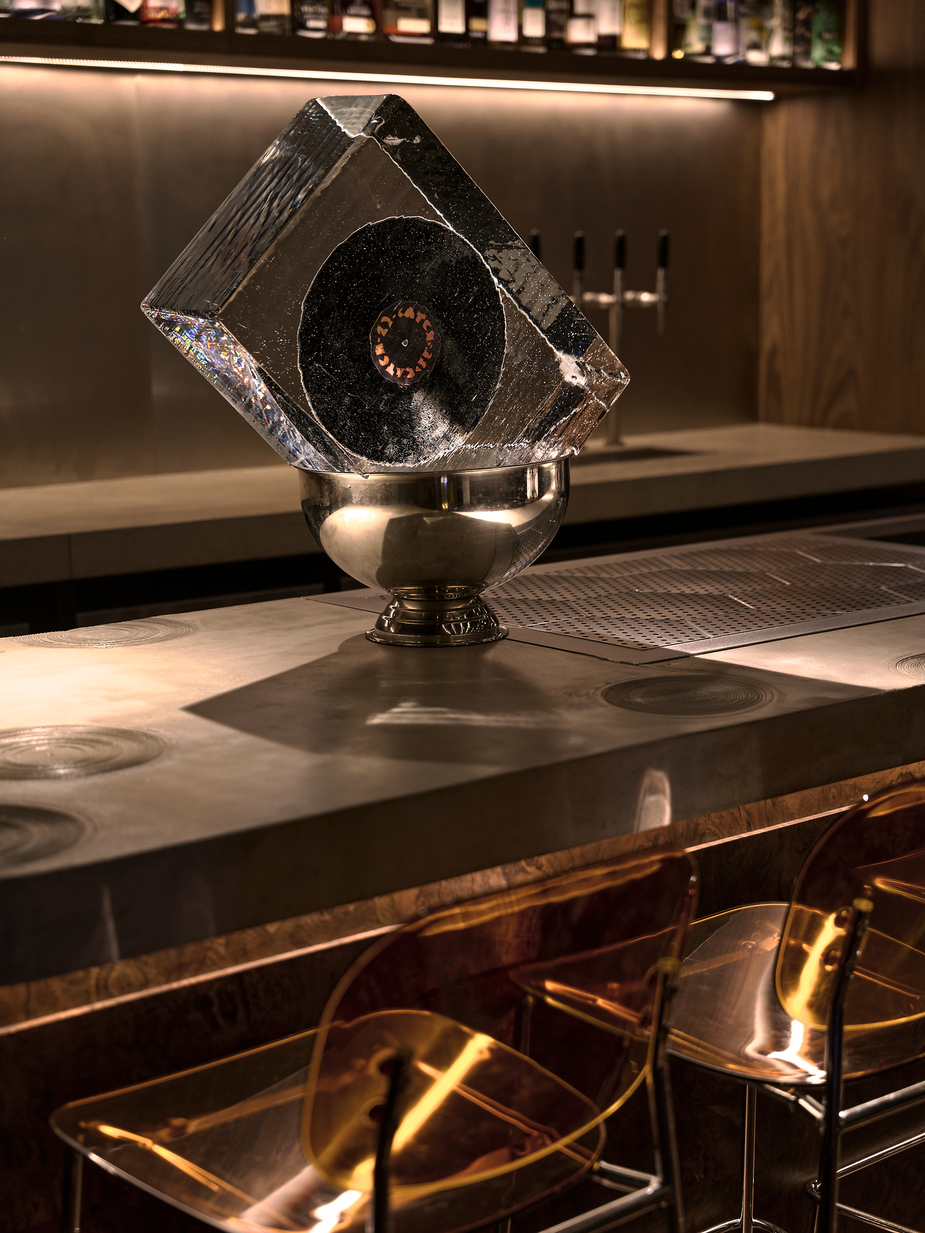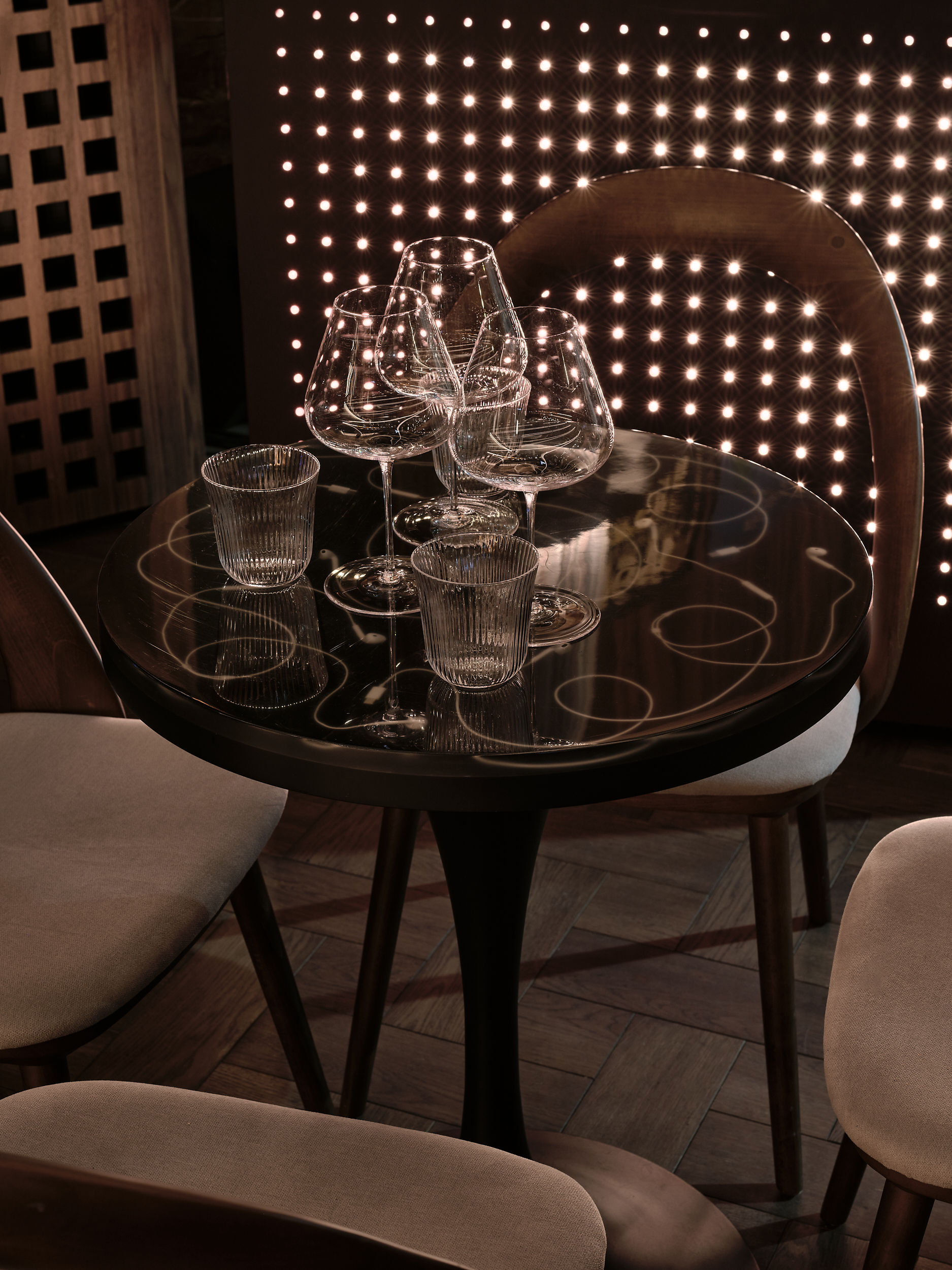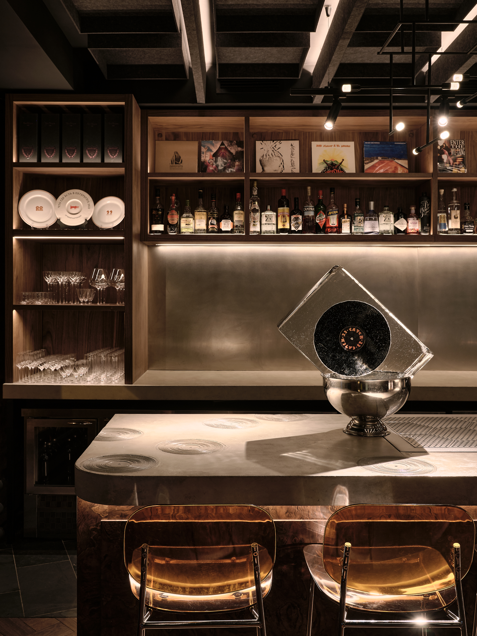 The centrepiece is the bar counter – finished in Walnut Burl veneer. A custom shelving unit in American Walnut houses the bar’s vinyl collection, memorabilia as well as the impressive hi-fi equipment.