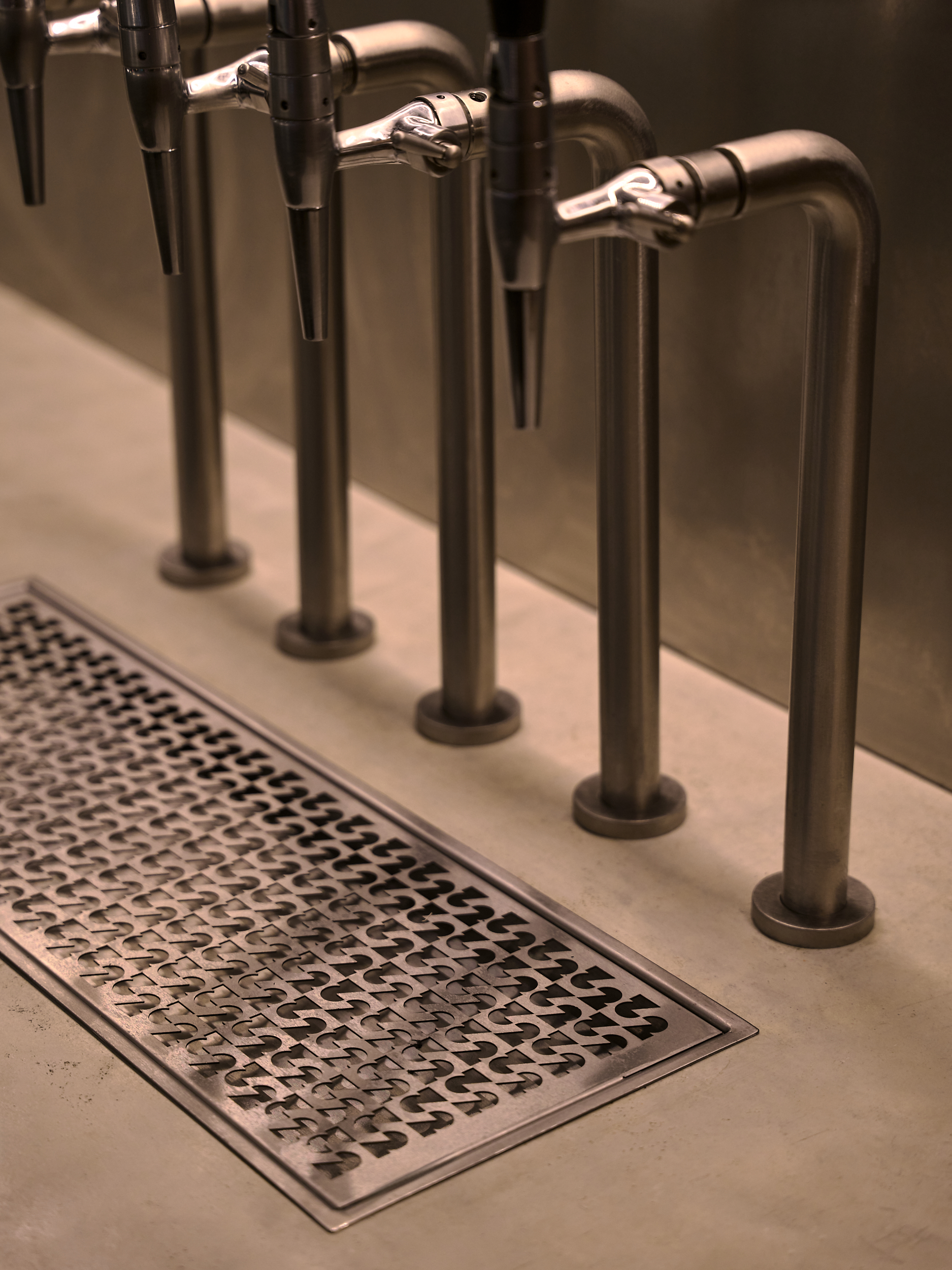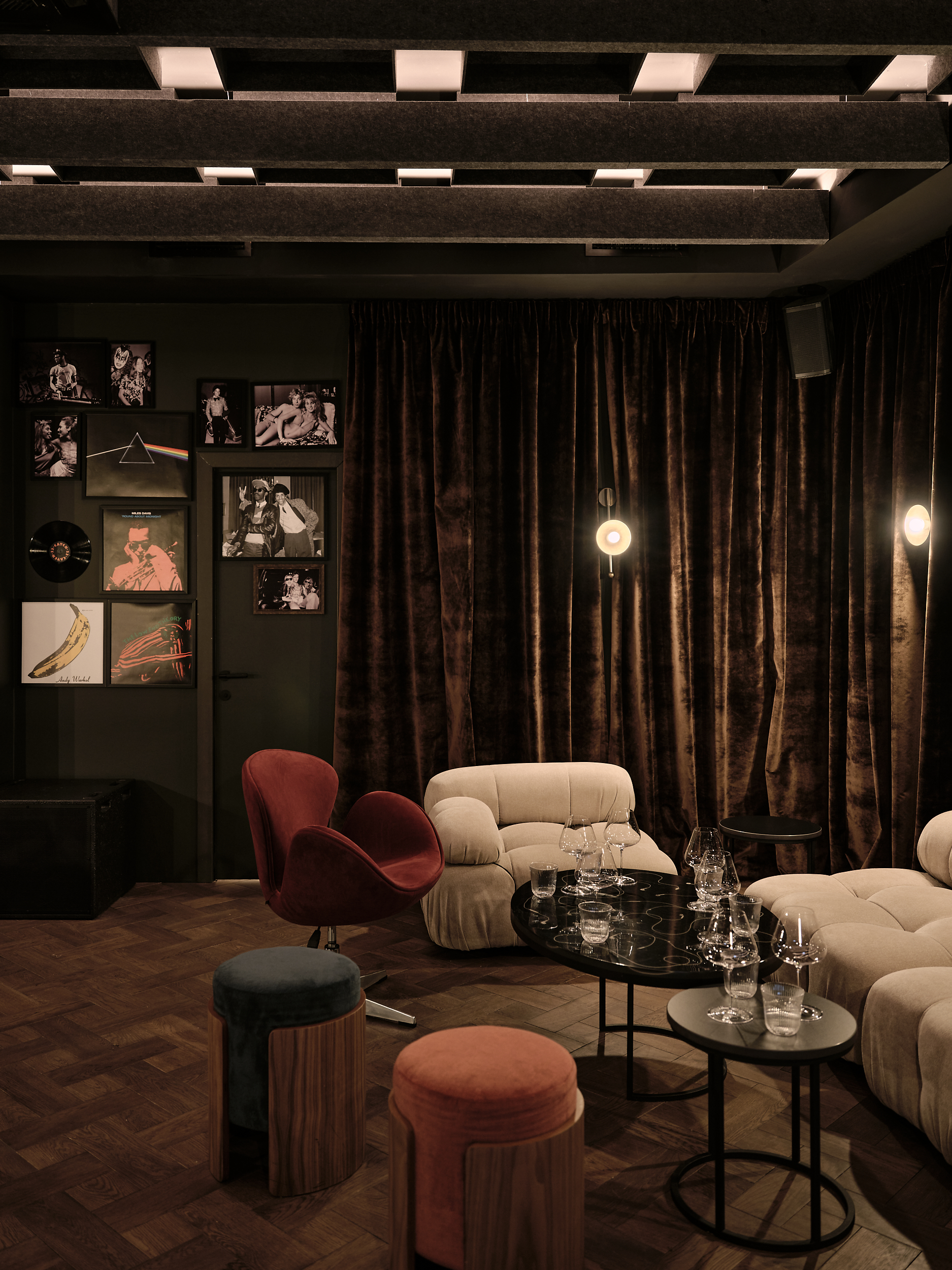 Catch 22 is a listening bar, split across two distinct zones – the first being lively and dynamic, with the option of clearing seating for a more club-like environment, while the second is a subdued, sultry lounge space, draped in velvet and populated with comfortable sofas and armchairs. Both spaces are dark and tactile, with a touch of casualness that gives the space a lived-in aesthetic.